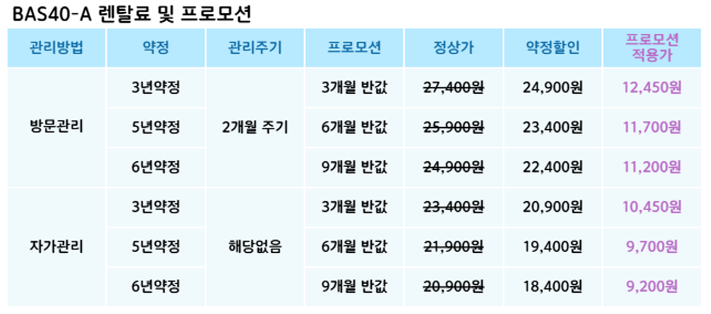 BAS40-A 코웨이 [코웨이] 스스로케어 비데(일반형) 제품분류 비데 AS기간 렌탈기간내 최저 렌탈가 월 18,400 (렌탈가) 제휴카드 할인가 월 (렌탈가) 3년 5년 6년 자가관리 방문관리/2개월 할인 제휴카드 보기 렌탈신청 장바구니