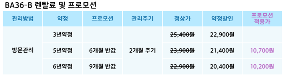 BA36-B 코웨이 [코웨이] 프라임 비데 제품분류 비데 AS기간 렌탈기간내 최저 렌탈가 월 20,400 (렌탈가) 제휴카드 할인가 월 (렌탈가) 3년 5년 6년 방문관리/2개월 할인 제휴카드 보기 렌탈신청 장바구니