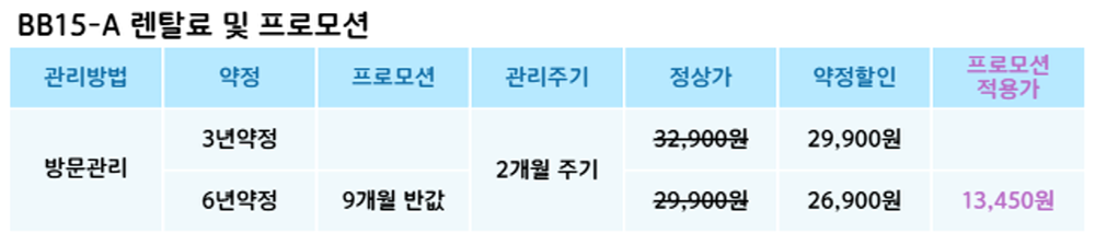 BB15-A 코웨이 [코웨이] 연수기 제품분류 연수기 AS기간 렌탈기간내 최저 렌탈가 월 26,900 (렌탈가) 제휴카드 할인가 월 (렌탈가) 3년 6년 방문관리/2개월 할인 제휴카드 보기 렌탈신청 장바구니
