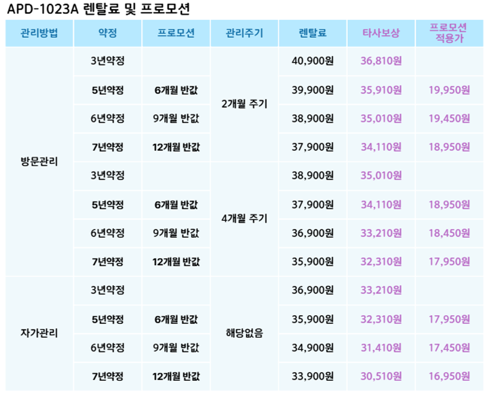 APD-1023A 코웨이 [코웨이] 듀어클린 제습 공기청정기 9평형 제품분류 청정기 기능 제습기능 AS기간 렌탈기간내 최저 렌탈가 월 33,900 (렌탈가) 제휴카드 할인가 월 (렌탈가) 3년 5년 6년 7년 자가관리 방문관리/4개월 방문관리/2개월 할인 제휴카드 보기 렌탈신청 장바구니
