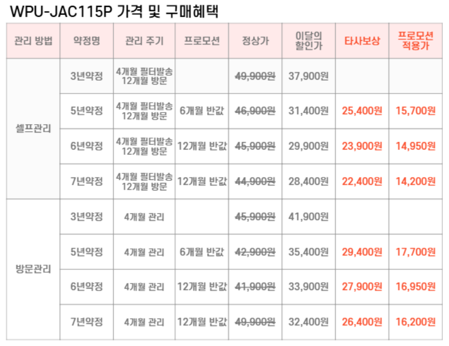 WPU-JAC115P SK매직 [SK매직] PSG 초소형 플러스 직수 정수기 제품분류 정수기 정수방식 직수형 기능 냉온전용 AS기간 렌탈기간내 최저 렌탈가 월 22,400 (렌탈가) 제휴카드 할인가 월 (렌탈가) 3년 5년 6년 7년 셀프관리 방문관리/4개월 셀프관리(타사보상) 방문관리/4개월(타사보상) 제품색상 선택 네이비 + 0원 화이트 + 0원 할인 제휴카드 보기 렌탈신청 장바구니