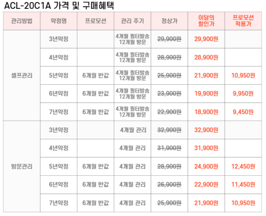 ACL-20C1A SK매직 [SK매직] 올클린 공기청정기 20평형 제품분류 청정기 AS기간 렌탈기간내 최저 렌탈가 월 18,900 (렌탈가) 제휴카드 할인가 월 (렌탈가) 3년 4년 5년 6년 7년 셀프관리 방문관리/4개월 제품색상 선택 화이트 + 0원 할인 제휴카드 보기 렌탈신청 장바구니