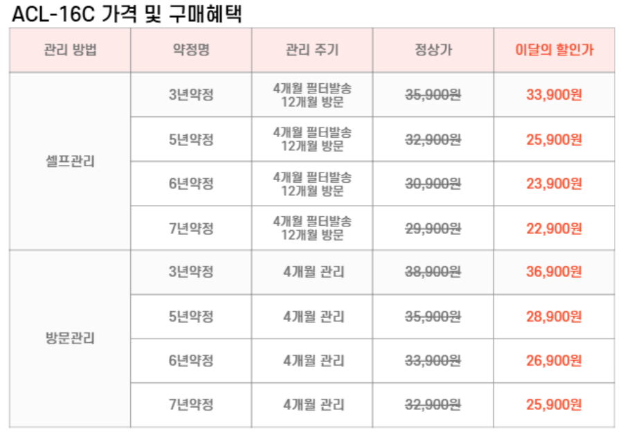 ACL-16C SK매직 [SK매직] 올클린 디아트 공기청정기 16평형 제품분류 청정기 AS기간 렌탈기간내 최저 렌탈가 월 22,900 (렌탈가) 제휴카드 할인가 월 (렌탈가) 3년 5년 6년 7년 셀프관리 방문관리/4개월 제품색상 선택 오트밀베이지 + 0원 다크그린 + 0원 할인 제휴카드 보기 렌탈신청 장바구니