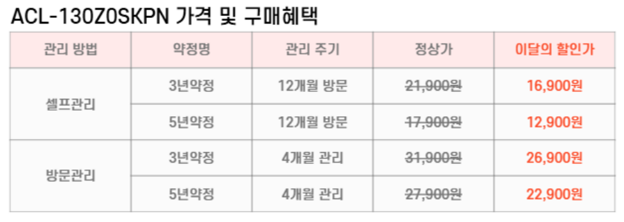 ACL-130Z0SKPN SK매직 [SK매직] PSG 코어 공기청정기 13평형 제품분류 청정기 AS기간 렌탈기간내 최저 렌탈가 월 12,900 (렌탈가) 제휴카드 할인가 월 (렌탈가) 3년 5년 셀프관리 방문관리/4개월 제품색상 선택 네이비 + 0원 할인 제휴카드 보기 렌탈신청 장바구니