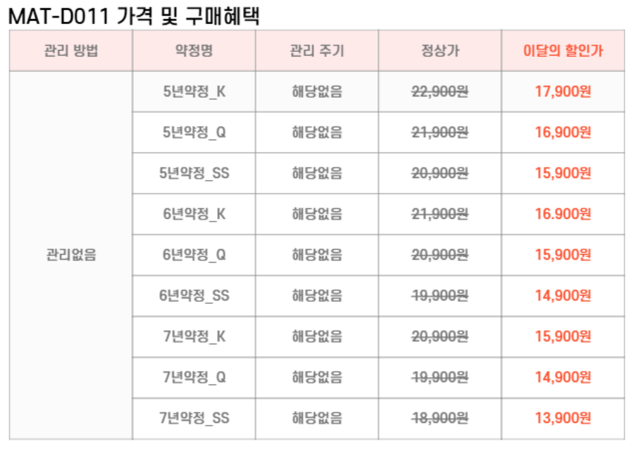 MAT-SD011,MAT-QD011,MAT-KD011 SK매직 [SK매직] 에코 휴 파운데이션 브라운(슈퍼싱글,퀸,킹) 제품분류 침대 AS기간 렌탈기간내 최저 렌탈가 월 13,900 (렌탈가) 제휴카드 할인가 월 (렌탈가) 5년 6년 7년 슈퍼싱글 퀸 킹 할인 제휴카드 보기 렌탈신청 장바구니