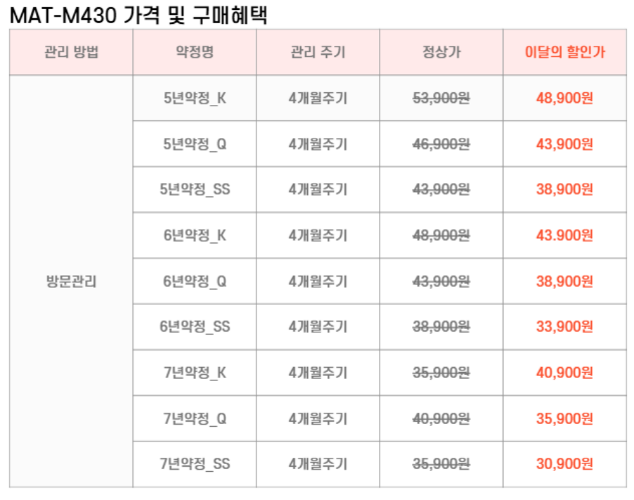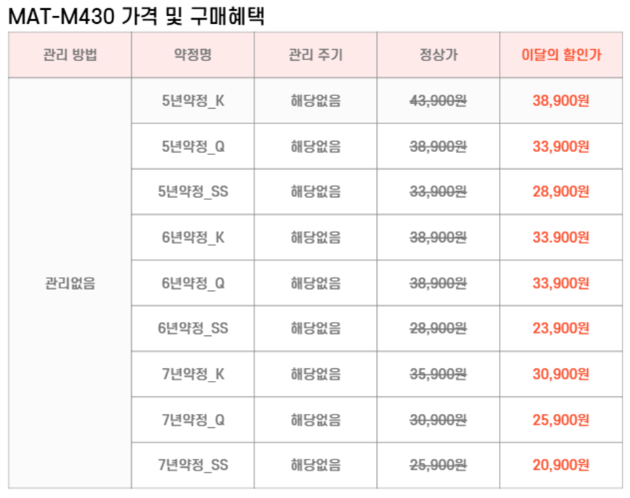 MAT-SM430,MAT-QM430,MAT-KM430 SK매직 [SK매직] 워커힐 클라우드 매트리스(슈퍼싱글,퀸,킹) 제품분류 매트리스 AS기간 렌탈기간내 최저 렌탈가 월 20,900 (렌탈가) 제휴카드 할인가 월 (렌탈가) 5년 6년 7년 슈퍼싱글 퀸 킹 자가관리 방문관리/4개월 할인 제휴카드 보기 렌탈신청 장바구니