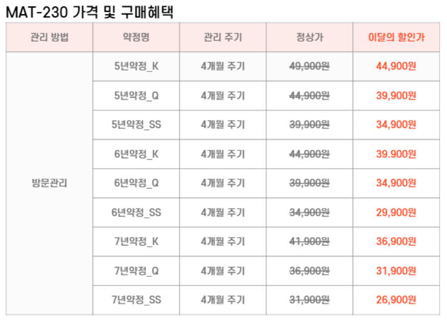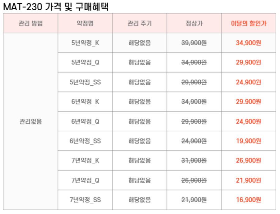 MAT-SM230,MAT-QM230,MAT-KM230 SK매직 [SK매직] 워커힐 스위트 매트리스(슈퍼싱글,퀸,킹) 제품분류 매트리스 AS기간 렌탈기간내 최저 렌탈가 월 16,900 (렌탈가) 제휴카드 할인가 월 (렌탈가) 5년 6년 7년 슈퍼싱글 퀸 킹 자가관리 방문관리/4개월 할인 제휴카드 보기 렌탈신청 장바구니