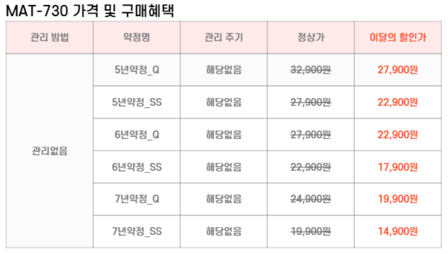 MAT-SM730,MAT-QM730 SK매직 [SK매직] 워커힐 스탠다드 매트리스(슈퍼싱글,퀸) 제품분류 매트리스 AS기간 렌탈기간내 최저 렌탈가 월 14,900 (렌탈가) 제휴카드 할인가 월 (렌탈가) 5년 6년 7년 슈퍼싱글 퀸 할인 제휴카드 보기 렌탈신청 장바구니
