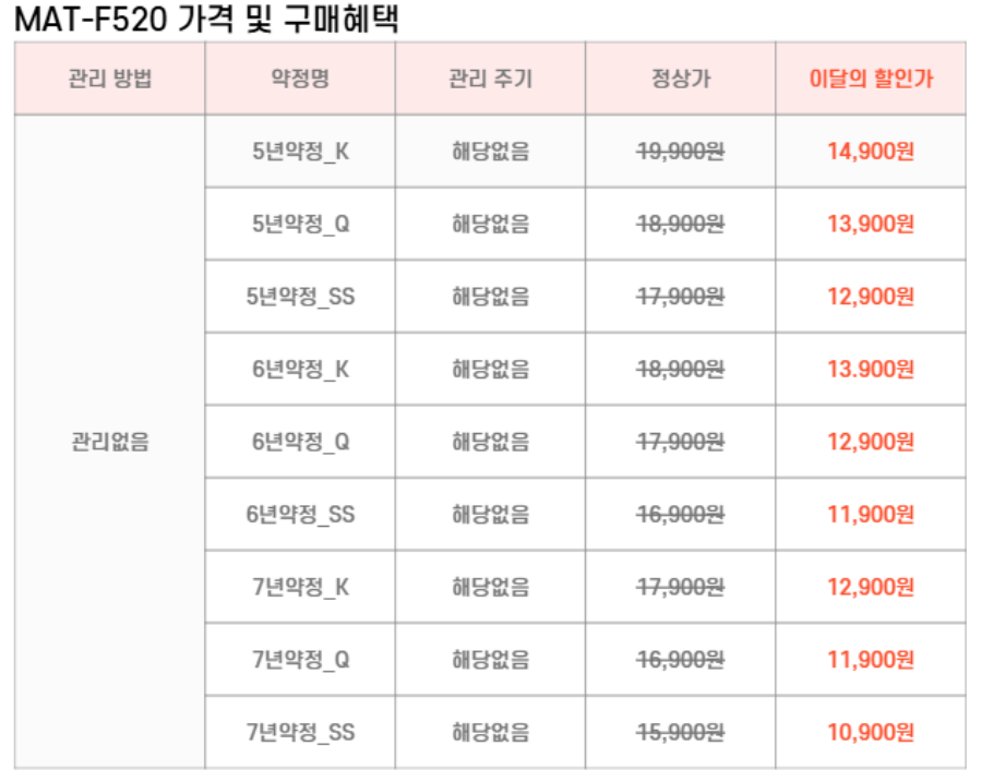 MAT-SF520,MAT-QF520,MAT-KF520 SK매직 [SK매직] 패브릭 파운데이션(슈퍼싱글,퀸,킹) 제품분류 침대 AS기간 렌탈기간내 최저 렌탈가 월 10,900 (렌탈가) 제휴카드 할인가 월 (렌탈가) 5년 6년 7년 슈퍼싱글 퀸 킹 할인 제휴카드 보기 렌탈신청 장바구니
