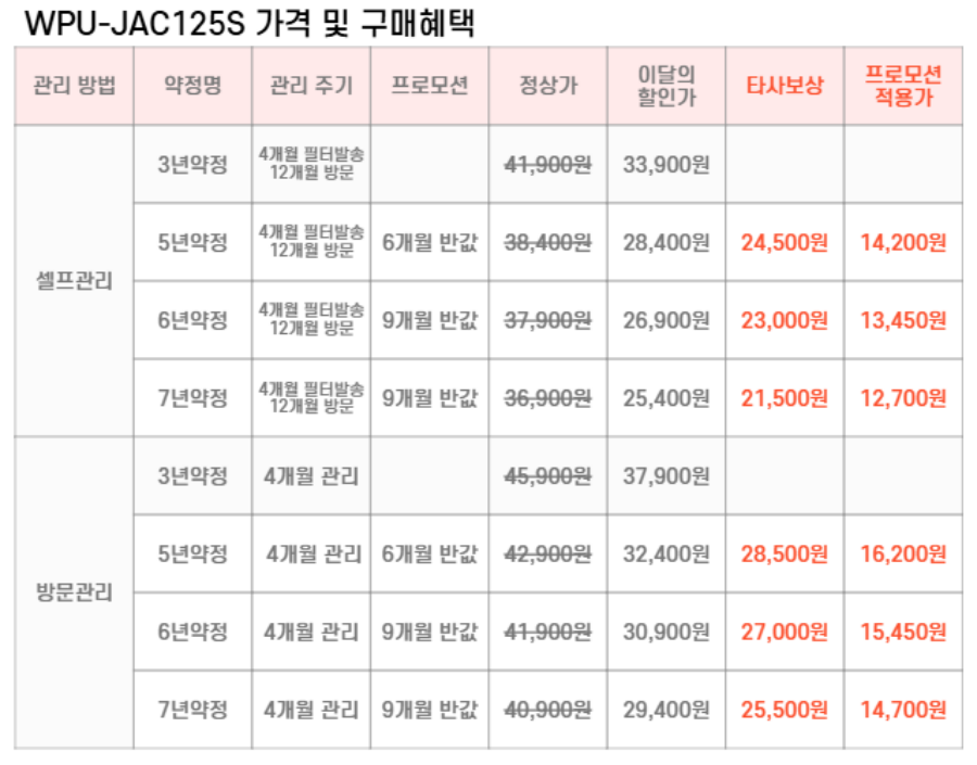 WPU-JAC125S SK매직 [SK매직] 초소형 라이트 직수 냉온정수기 제품분류 정수기 정수방식 직수형 기능 냉온전용 AS기간 렌탈기간내 최저 렌탈가 월 21,500 (렌탈가) 제휴카드 할인가 월 (렌탈가) 3년 5년 6년 7년 셀프관리 방문관리/4개월 셀프관리(타사보상) 방문관리/4개월(타사보상) 제품색상 선택 내추럴화이트 + 0원 소프트핑크 + 0원 바닐라베이지 + 0원 할인 제휴카드 보기 렌탈신청 장바구니