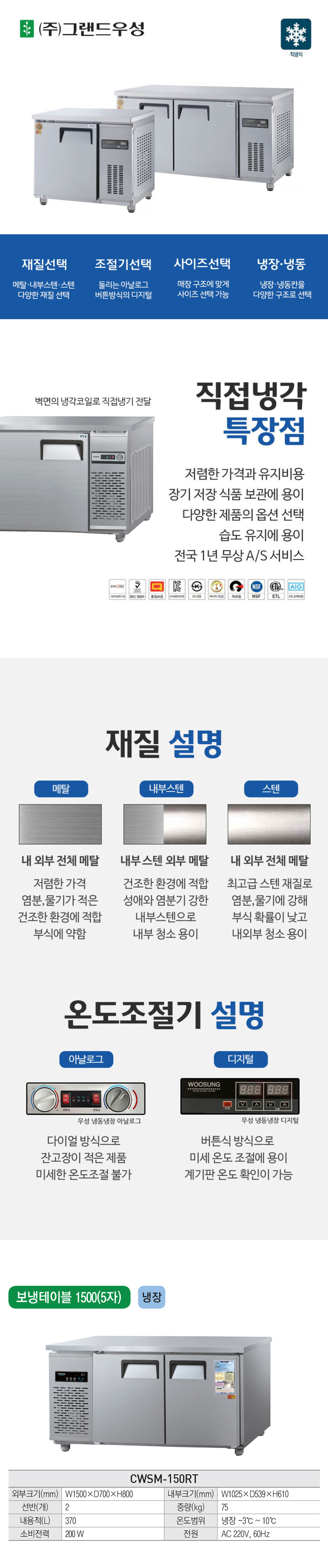 CWSM-150RT_올스텐 유버스 [그랜드우성] 직냉식 테이블 냉장고 370L 올스텐 제품분류 업소용 용량(총량) 300L이상 기능 2도어 AS기간 1년 최저 렌탈가 월 41,800 (렌탈가) 제휴카드 할인가 월 (렌탈가) 3년 4년 5년 할인 제휴카드 보기 렌탈신청 장바구니